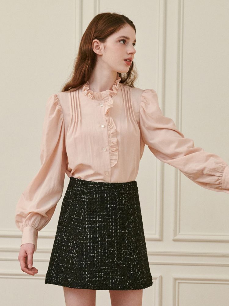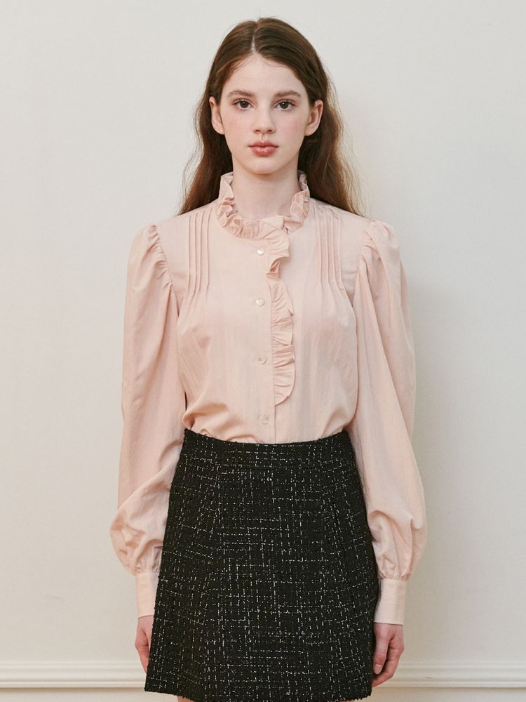 완성도 높은 디테일의 블라우스 제품입니다. 목 라인에서부터 가슴까지 이어진 러플 디자인이 사랑스러운 무드로 연출됩니다. 퍼프 소매에, 앞 상단 주름 핀턱 디테일이 특징이며 귀여운 모양의 글로시한 단추가 포인트입니다. 깨끗한 아이보리 컬러와 은은한 느낌의 핑크컬러로 구성되었습니다.