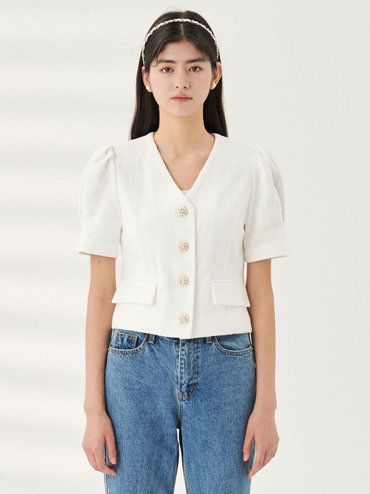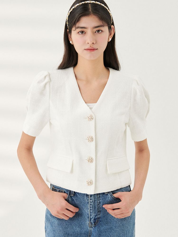 크롭한 기장감에 내추럴한 느낌의 코튼소재의 여름 자켓입니다. 깔끔하게 떨어지는 라인과 퍼프소매가 단정하면서도 우아한 느낌을 자아냅니다. 심플한 디자인에 고급스러운 단추로 포인트를 더해주었습니다.