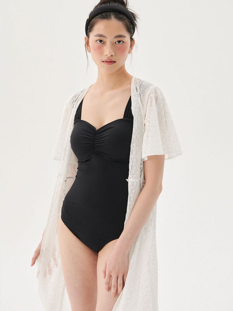 로맨틱한 무드로 연출이 가능한 레이스 소재의 시스루 로브입니다. 러플소매가 우아하게 떨어지며 체형 커버가 가능하여 수영복 위에 커버업으로 활용도가 높은 상품입니다. 허리선을 높게 잡아 다리를 길어보이게 연출해주며 레이스로 시원하게 착용이 가능합니다.