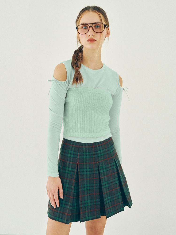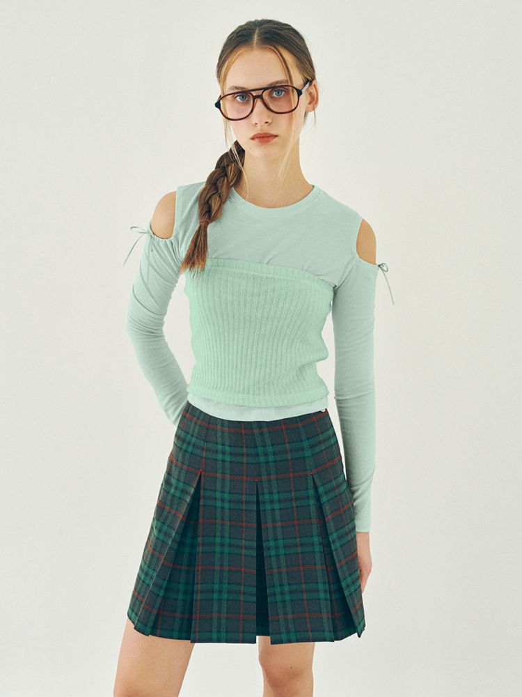 트렌디한 무드의 티셔츠&뷔스티에 세트 제품입니다. 적당한 두께감의 신축성 좋은 원단을 사용한 티셔츠입니다. 레이어드하여 착용하거나 각 단품으로도 착용이 가능해 활용도 높은 아이템입니다. 어깨 부분의 컷아웃과 리본 디테일이 유니크한 디자인으로 소장가치가 높으며 소프트한 크림과 민트 총 2가지 컬러로 출시되었습니다.