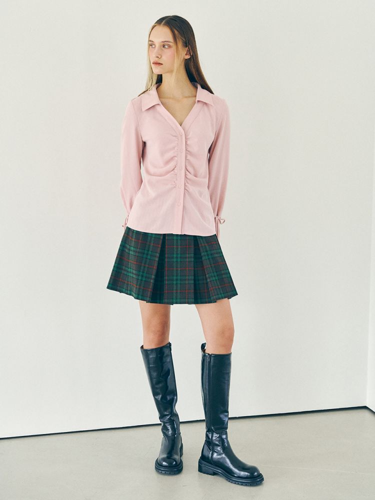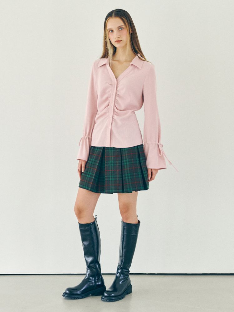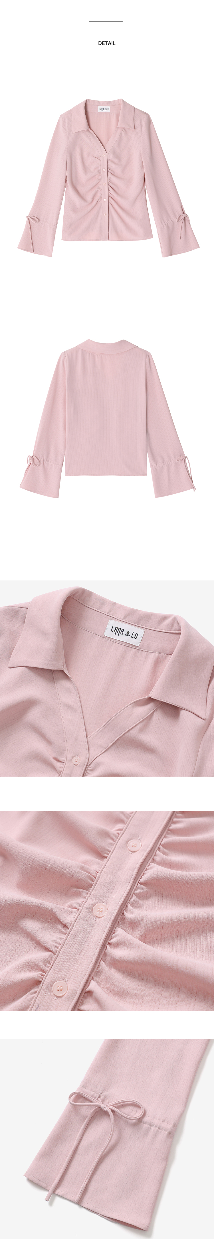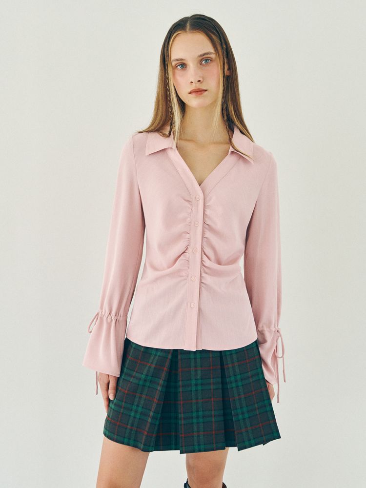 셔링 디테일이 매력적인 블라우스입니다. 슬라브 조직의 쉬어한 느낌이 가미된 소재가 내츄럴한 무드를 표현합니다. 앞 중심 라인을 따라 잡혀있는 셔링 디테일과 벨소매 실루엣이 유니크한 아이템입니다. 포근한 핑크컬러로 출시되었습니다.